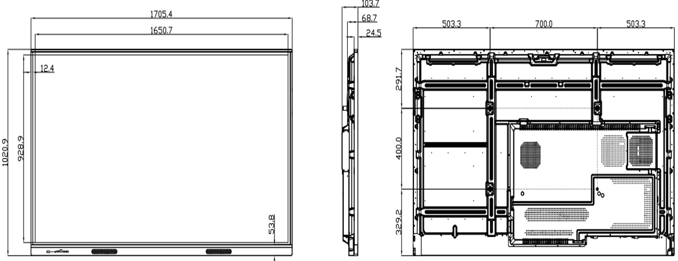 - – Phía sau: HDMI in*2; USB-A3.0*1; USB-A2.0*1; USB (touch)*1; Line out*1; RJ45*1; Mic in*1; Optical out*1; RS232*1